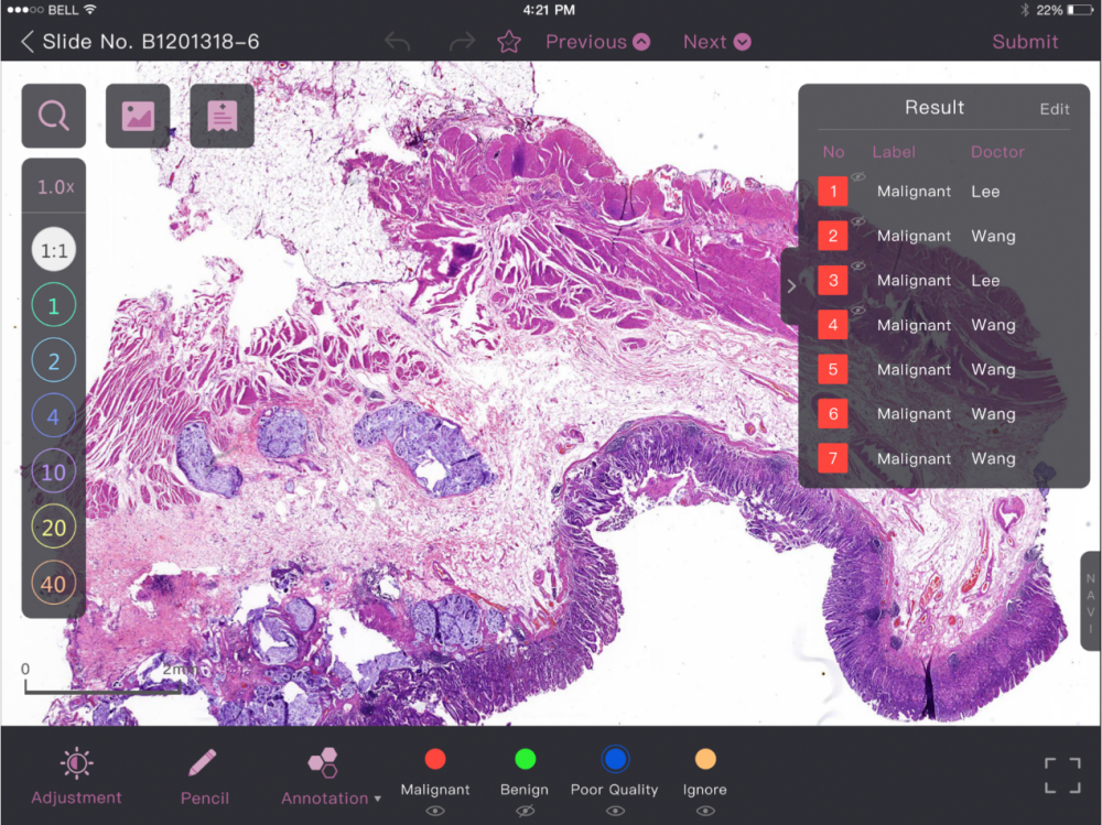 图2. 基于iPad和Apple Pencil的标注工具,能够快速完成病理影像的标注过程,并内置严格的审核流程