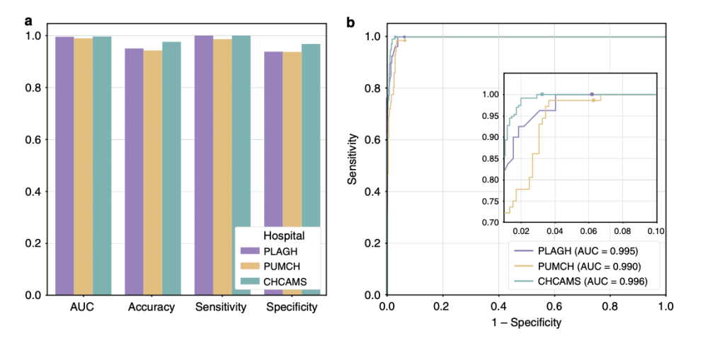 图4. 多中心测试结果,模型在医科院肿瘤医院与北京协和医院的样本上获得了接近100%的灵敏度和超过90%的特异性