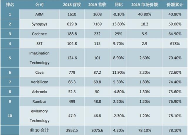 下图为全球2019年半导体IP供应商营收前十,前三是ARM、新思、铿腾电子;第二、第三也是大家熟知的EDA软件巨头。