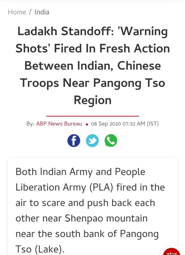 而印度军方在中国方面发布声明后十几个小时,才出来了一份姗姗来迟的声明,声明内容完全倒打一耙,称"2020年9月7日,是中国人民解放军试图接近我们在实控线上的一个前沿阵地,当我们的部队劝阻时,是解放军向空中发射了几发子弹,试图恐吓我们的部队。"