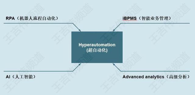 Gartner定义的超自动化,将RPA、智能业务管理(IBMPS)、人工智能(AI)及高级分析(AA:Advanced analytics)集合到一起,王吉伟频道将之简称为“RIAA”。