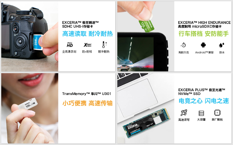 目前铠侠旗下的闪存产品已经完全覆盖之前的U盘系列, SD卡系列,固态硬盘系列。这些闪存设备都是采用铠侠(原东芝存储)自家生产的原厂颗粒制造,其品质与速度都非常不错,尤其是旗下的两款M.2固态硬盘RC10和RD10,颇受市场好评。